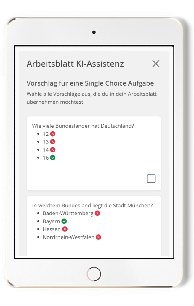 Für kleinere Abfragen kannst du einfach Fragen mit Ankreuzmöglichkeiten in dein Arbeitsblatt einfügen. Hierbei kannst du zwischen Single Choice und Multiple Choice Aufgaben wählen. Markiere bereits bei der Erstellung der Frage die richtige Antwort mit einem Häkchen – so werden die richtigen Antworten deiner Schüler*innen bei der Auswertung angezeigt und automatisch ausgewertet.