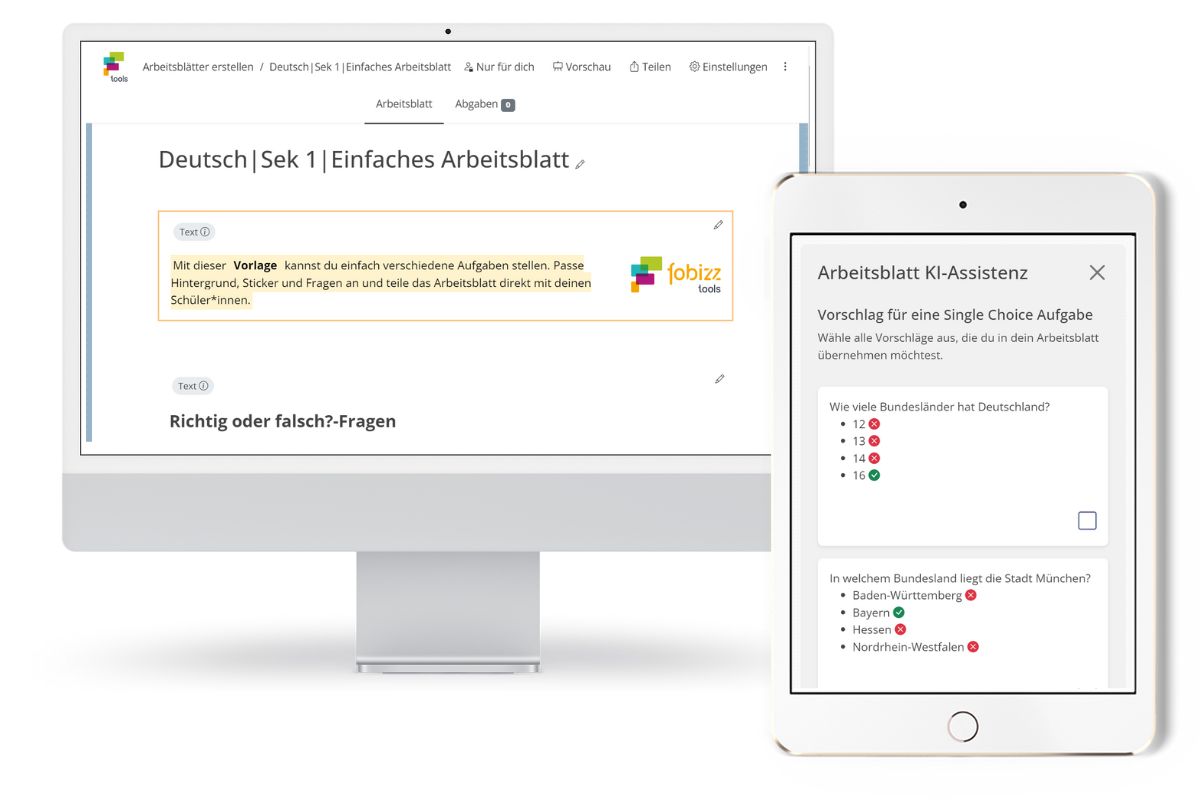 Neben dem Arbeitsblatt bieten die fobizz Tools viele weitere praktische Tools und Helfer für deinen Unterricht. Die fobizz Tools wurden speziell für Lehrkräfte und den Einsatz in Schule und Unterricht entwickelt, erfordern keine Registrierung deiner Schüler*innen und sind werbefrei!