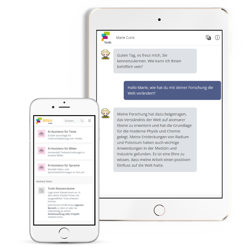 Mit den fobizz Klassenräumen erhalten deine Schüler*innen ihren eigenen Zugang zur fobizz KI-Assistenz und können DSGVO-konform damit arbeiten.