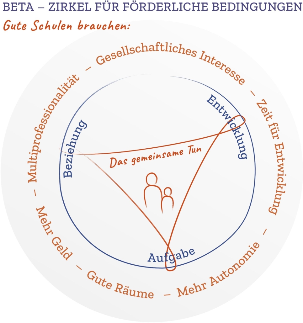 Im Außenkreis findet man im BETA-Zirkel schließlich die förderlichen Bedingungen, die gute Schulen brauchen. Sie können als Faktoren hemmend oder unterstützend wirken. Es gibt allerdings auch Schulen, die sich im Innenkreis, also aus dem eigenen System und aus eigener Kraft auch bei widrigen Umständen sehr innovativ entwickelt haben! Hier sind einige Brennpunktschulen zu finden, die aus der Not kreativ wurden. Es macht Mut, diese Schulen anzuschauen, gute Ideen zu adaptieren und anzupassen, wie es für das eigene System Schule passen kann. Auch hier wünsche ich allen Leser*innen den Mut, Neues zu wagen, auch Fehler oder Irrwege in Kauf zu nehmen, auch wenn wir die wahrscheinlich berufsbedingt nicht besonders mögen.