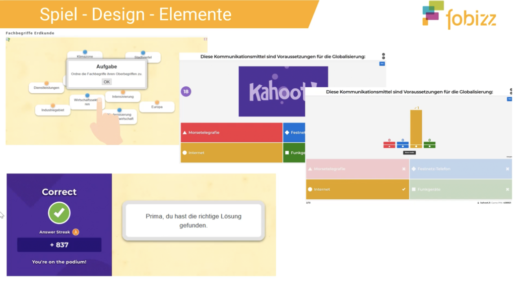Als erstes kommen einem sicherlich die Quizze zu Ferienbeginn oder Spiele in den Freistunden in den Kopf. Es ist aber auch gut möglich, am Ende von Unterrichtseinheiten mit Quizzen oder Spielen eine Lernzielkontrolle für Wissensabfragen oder einfache Transfer- und Anwendungsaufgaben durchzuführen. Der Vorteil liegt hier in einer deutlich freundlicheren Atmosphäre als bei klassischen Testformaten. Aber nicht nur durch das Spielen können Schüler*innen lernen, auch durch das Kreieren von eigenen Spielen für die Mitschüler*innen.
