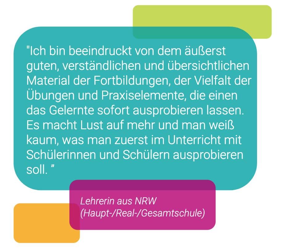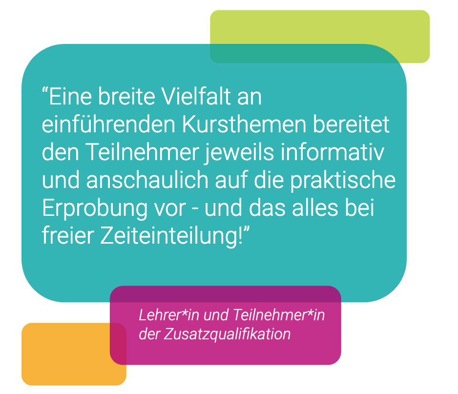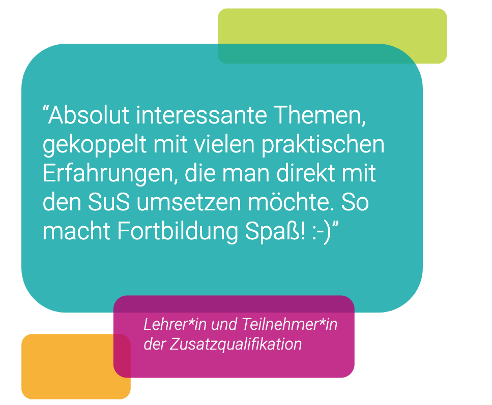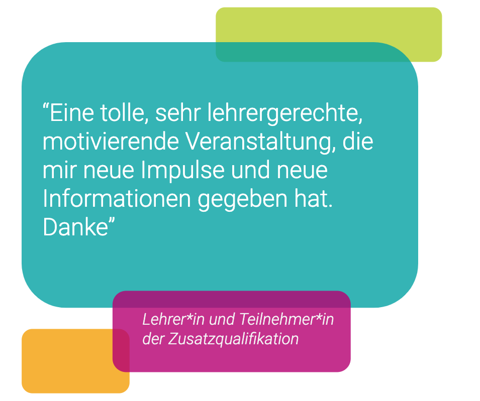 Insgesamt hat die Zusatzqualifikation den Lehrer*innen sehr gut gefallen, durchschnittlich gaben sie 9 von 10 Punkten als Feedback. Besonders die freie Zeiteinteilung, der direkte Bezug zum Unterricht und die freie Themenwahl hat sie begeistert.