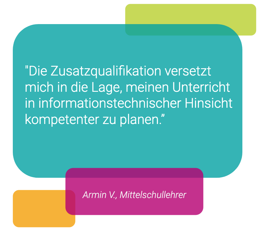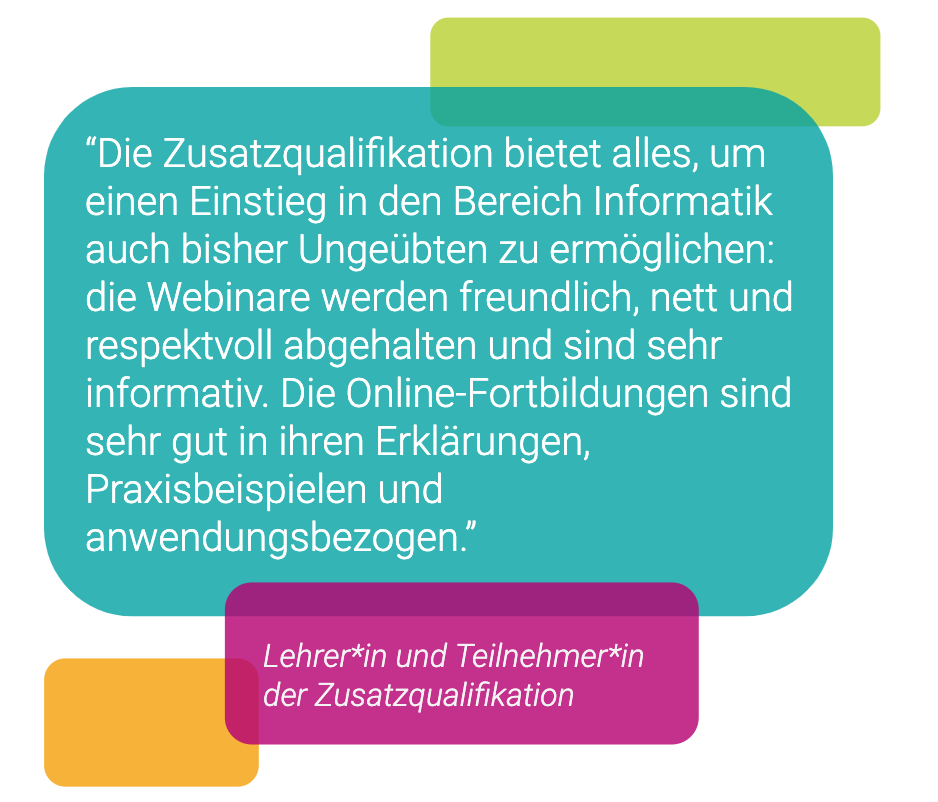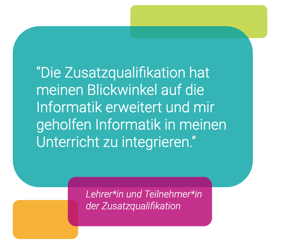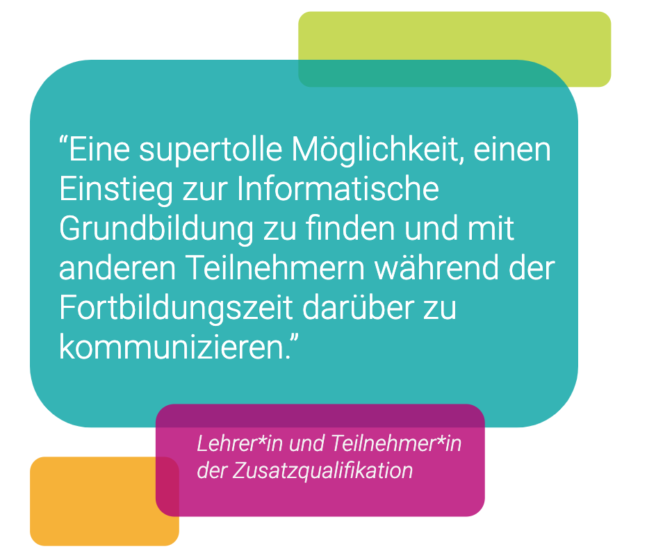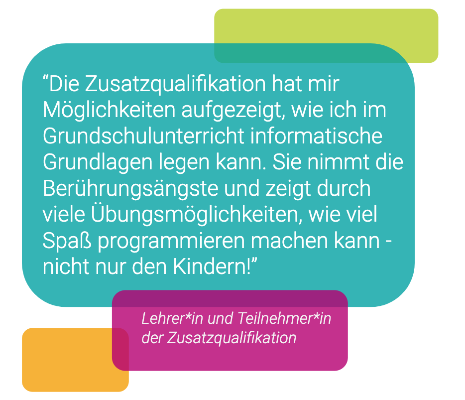 „Die Zusatzqualifikation nimmt die Berührungsängste und zeigt durch viele Übungsmöglichkeiten, wie viel Spaß programmieren machen kann – nicht nur den Kindern.“, sagt eine Lehrkraft. Sie wisse nun wie sie informatische Grundlagen in ihrem Unterricht vermitteln kann.
