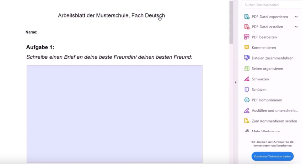 Ein Tool, mit dem du unkompliziert interaktive Arbeitsblätter im PDF-Format erstellen kannst, ist Sejda PDF. Deine Schüler*innen können deine Aufgabenblätter digital bearbeiten und ausfüllen, ohne dass sie das Arbeitsblatt erst ausdrucken müssen. Dabei kannst du verschiedene Textfelder, Checkboxen, Auswahloptionen und noch weitere interaktive Elemente in deine editierbaren Arbeitsblätter integrieren. Du kannst ganz einfach bestehende Arbeitsblätter im Word- oder PDF-Format in editierbare Dokumente umwandeln.