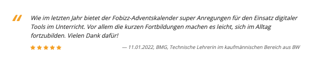 Im kostenfreien fobizz Adventskalender erwarten dich 24 spannende Mikro-Fortbildungen! Jeden Tag öffnet sich ein neues Türchen rund um das Thema digitale Medien. Dafür brauchst du keine Vorkenntnisse und nur 5 bis 15 Minuten Zeit pro Tag, versprochen! Du lernst tolle Tools und Tipps für den Einsatz im Unterricht kennen und machst im Anschluss jeweils eine kleine praktische Übung, um das Gelernte direkt auszuprobieren. ✨